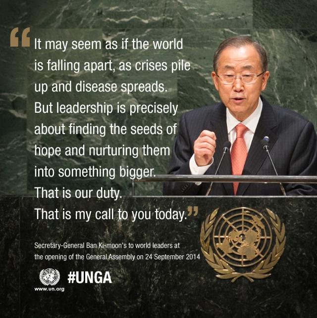Secretary-General Ban Ki-moon told more than 140 world leaders gathered in New York for the annual General Assembly General Debate that it may seem as if the world is falling apart, as crises pile up and disease spreads – but leadership is precisely about finding the seeds of hope and nurturing them into something bigger.